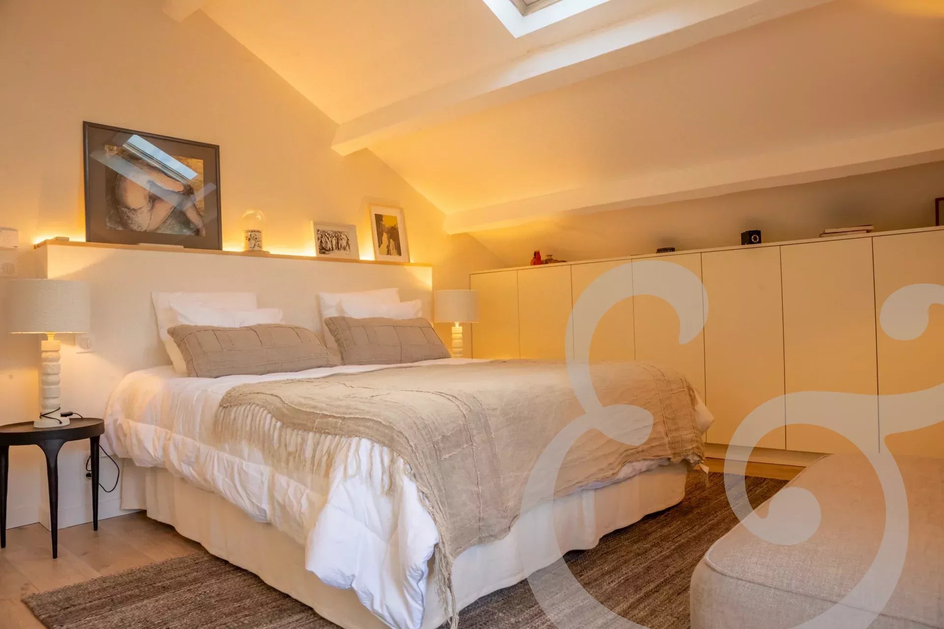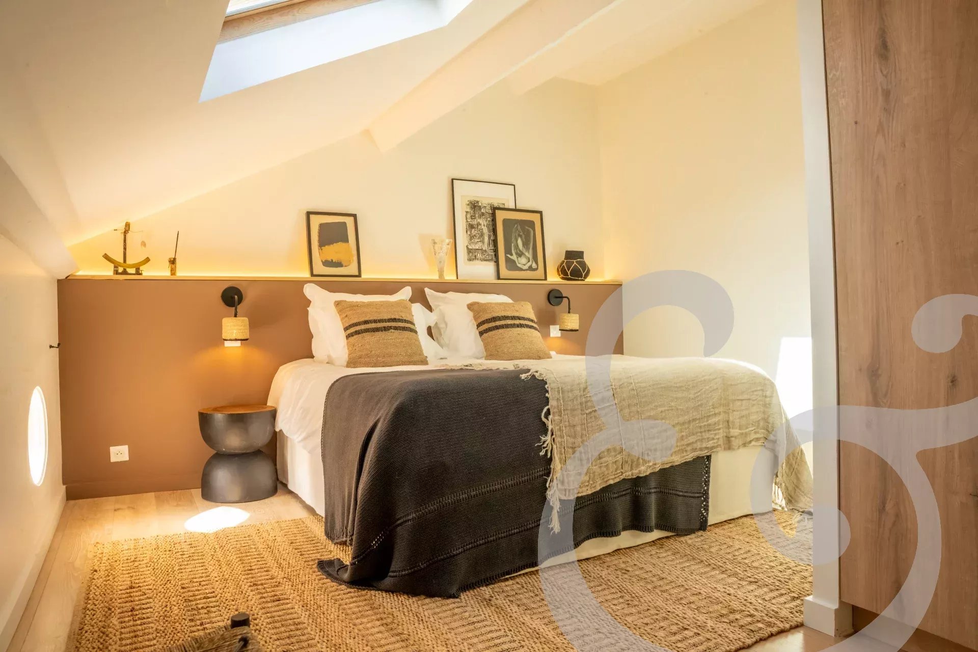 The ground floor features a cosy living area organised around a large lounge with a fireplace and natural stone flooring, and a contemporary kitchen with a central island, opening onto the dining room. A spacious master suite with a dressing room, bathroom and direct access to the garden completes this level.